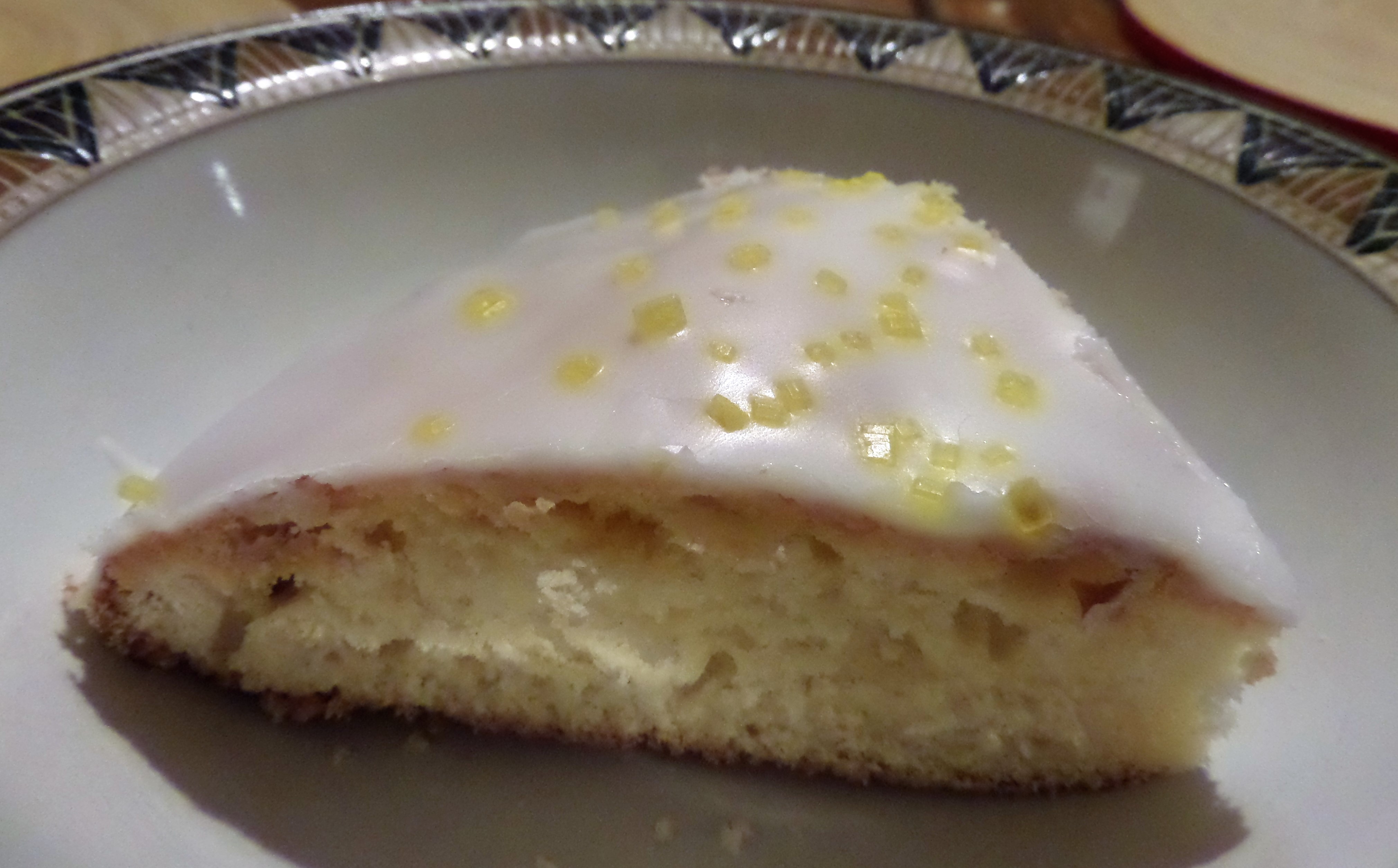 I think I made the icing a bit too runny! I added the yellow sprinkles just because I had some and otherwise it would have just been a white cake on a white plate. It still doesn’t look that photogenic.